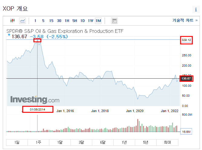 ETF 출시이후 최고점은 2014년 6월에 기록한 $329이며 금일 날짜 기준으로 $136.67 의 가격을 기록 중입니다.