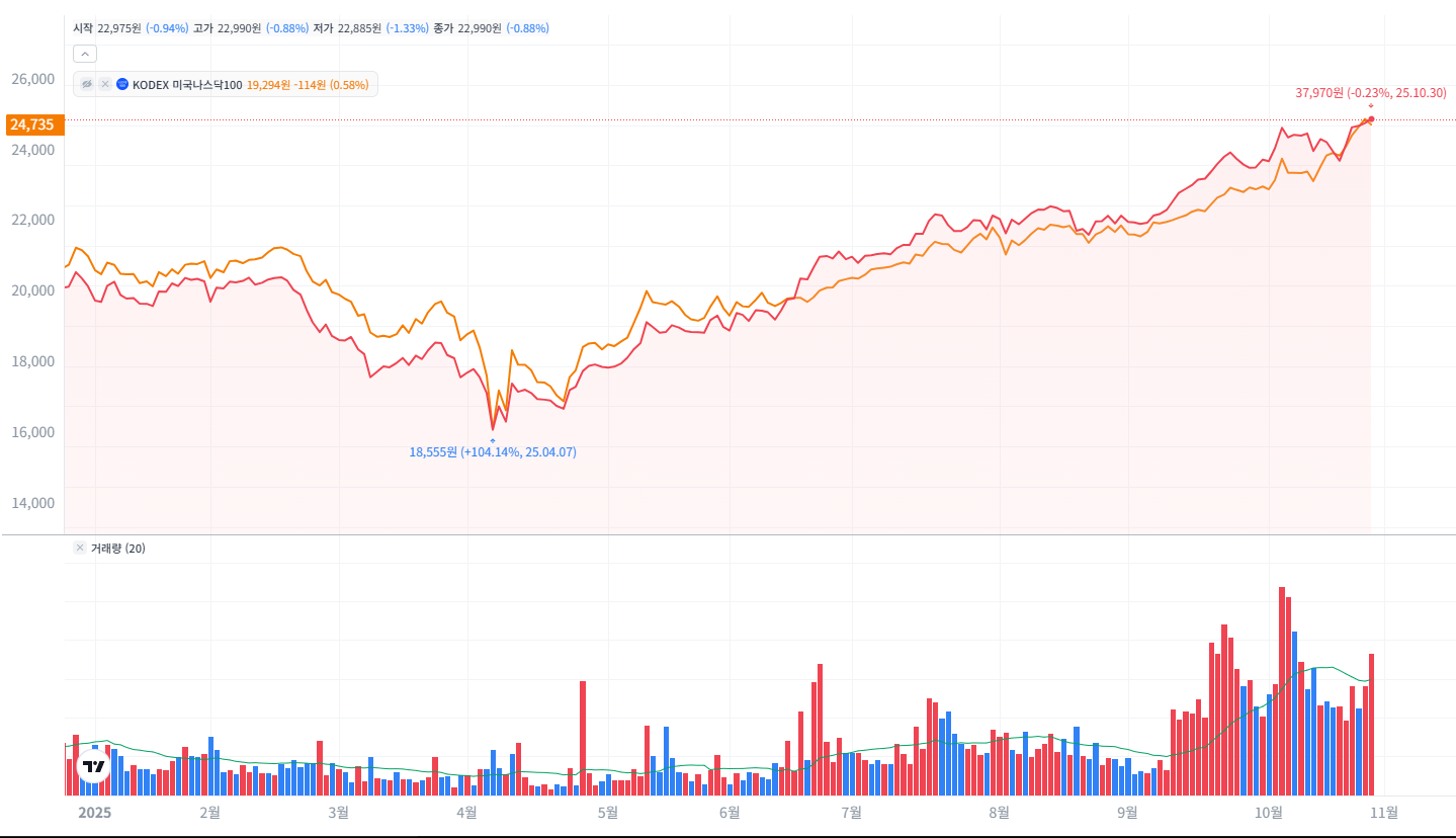 과거 1년간 패시브 펀드와의 수익율 비교를 해보도록 하겠습니다. 주황색이 나스닥 100 패시브 펀드인 KODEX 미국 나스닥 100 ETF입니다.