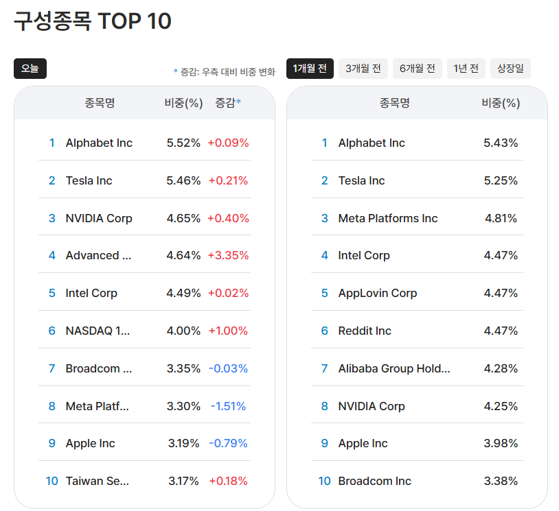 상위 TOP 10 종목을 보면 나스닥 100 시가 총액 1위인 NVIDIA가 1개월전 8위 , 금일 기준 3위 인것을 보실수 있습니다. 지수추종 패시브 인 경우는 금일 기준 투자 비중이 NVIDIA , 마이크로소프트 , 애플 등의 순서로 되어 있습니다.
